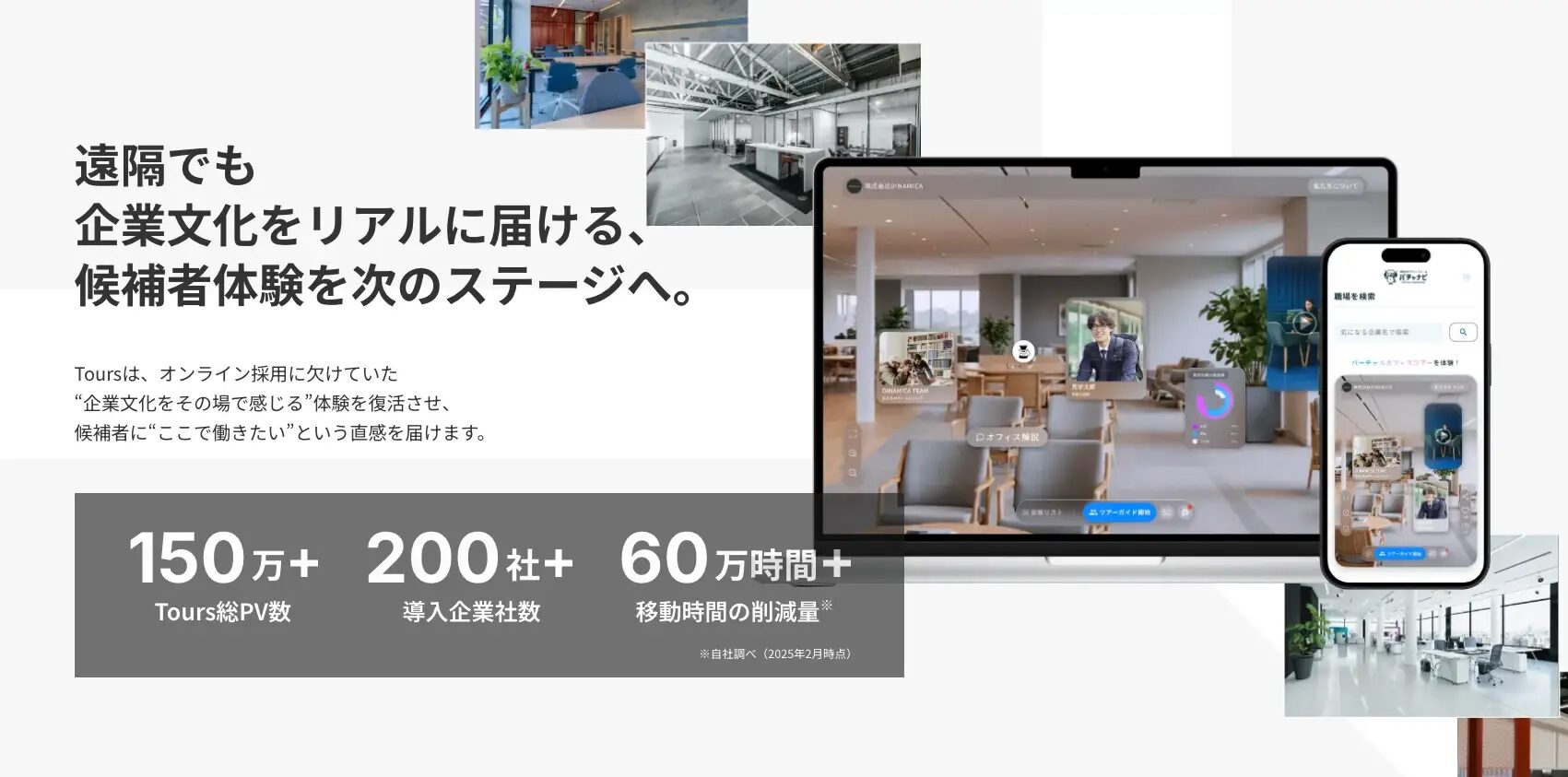 採用のオンライン化が進む中、企業の魅力を候補者に伝える方法が問われています。「Tours」は、遠隔でもまるでその場にいるかのような体験を提供するオンライン採用テクノロジーです。